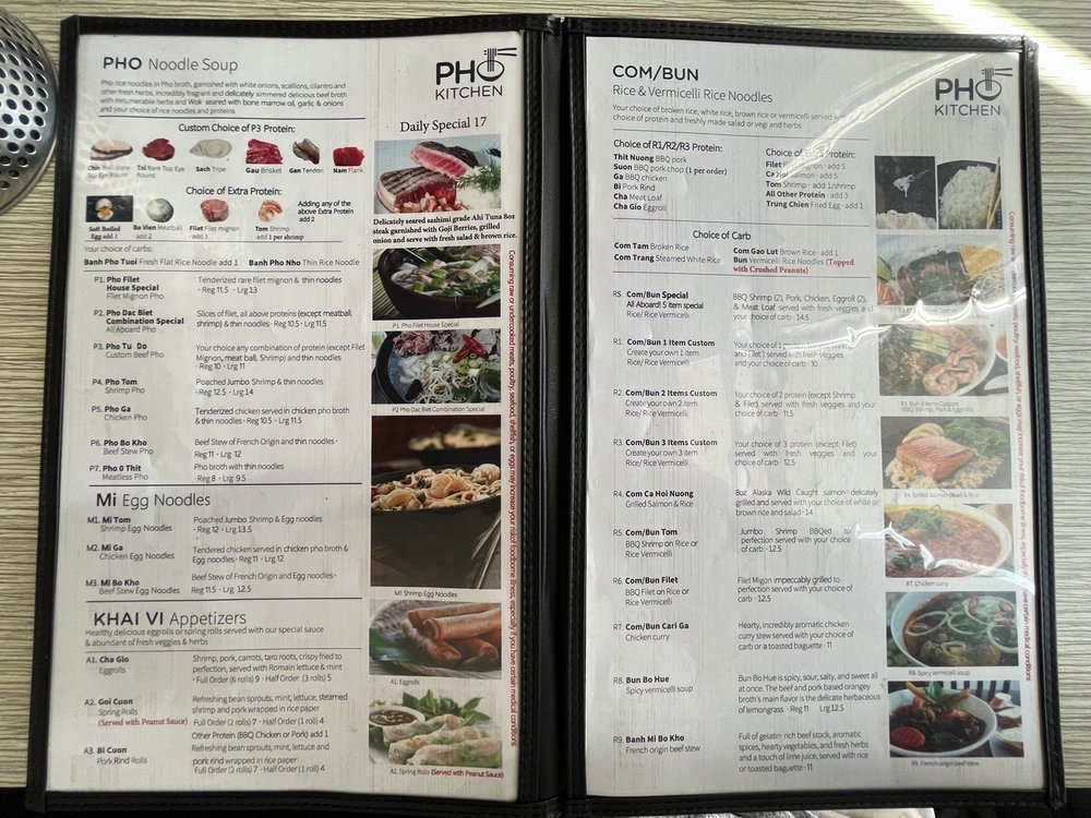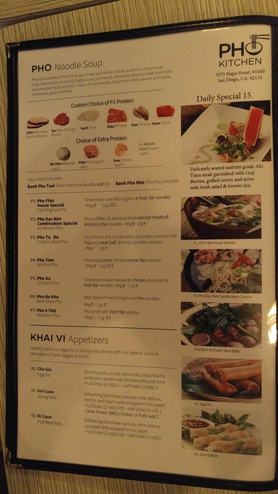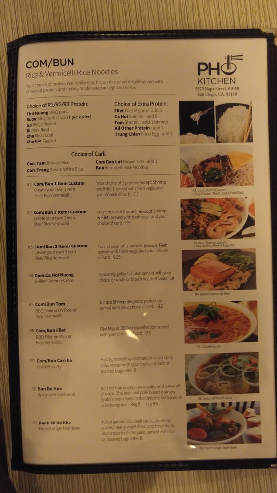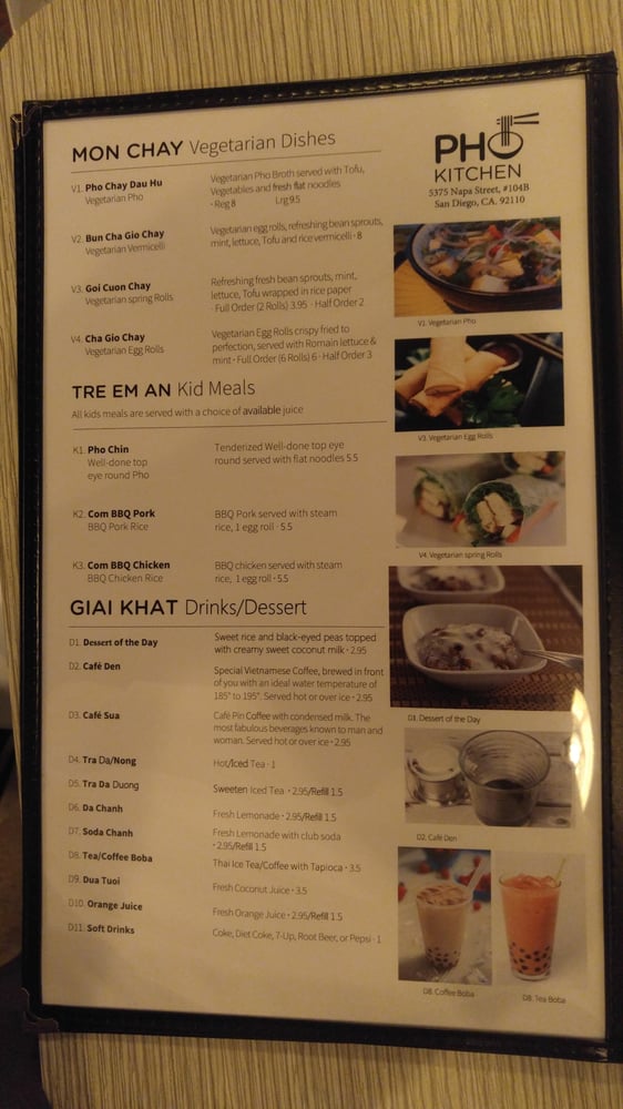 Welcome to Pho Kitchen, a Vietnamese gem located in San Diego. This restaurant offers a wide range of options catering to different dietary preferences including vegan and vegetarian choices. With a casual ambiance and friendly service, Pho Kitchen is perfect for lunch or dinner gatherings. The menu features traditional Vietnamese dishes like pho tai and bun specials, with generous portions at reasonable prices.